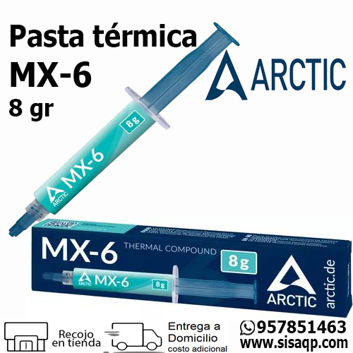 Marca : Arctic Linea : Pasta termica Modelo : Mx-6 Cantidad : 8 gr Alto rendimiento Muy Eficiente Ideal para jugadores y overclockers No es conductora No es capacitiva Presentación : Caja P/N : ACTCP00080A CONDICIONES COMERCIALES :Puedes comunicarte al 957851463